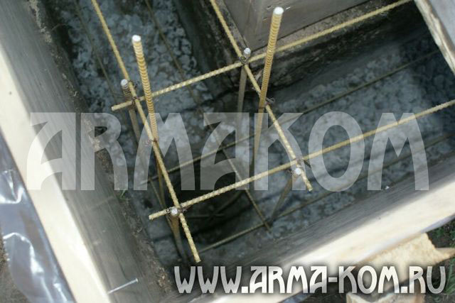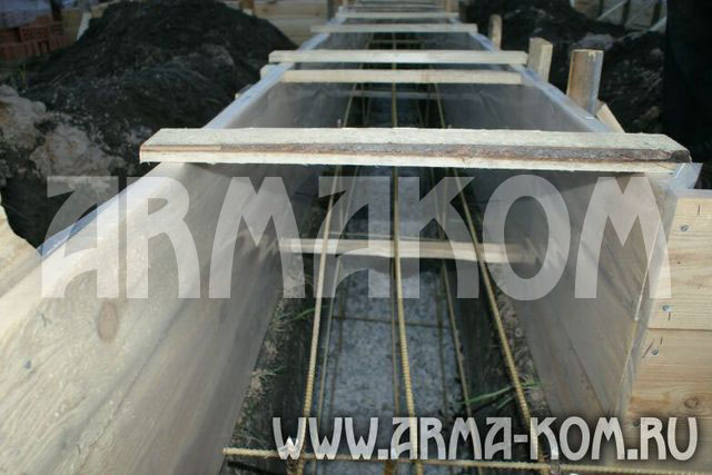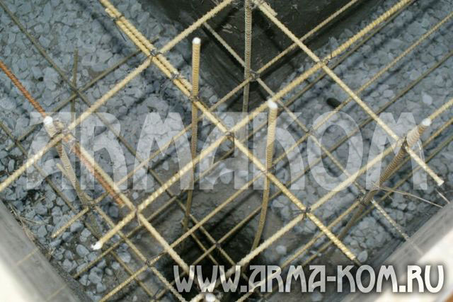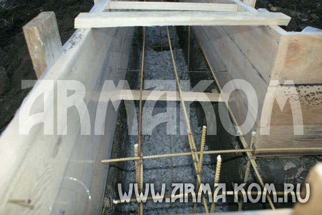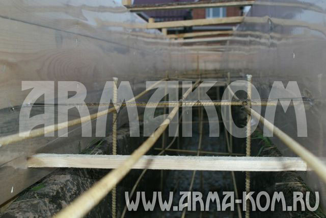 Армирование ленточного фундамента произведено композитной стеклопластиковой арматурой АСП-10 и АСП-8. Для вертикальных стержней применена АСП-10, а горизонтальных АСП-8. Увязка арматуры производилась вязальной проволокой диаметром 1.4 мм.